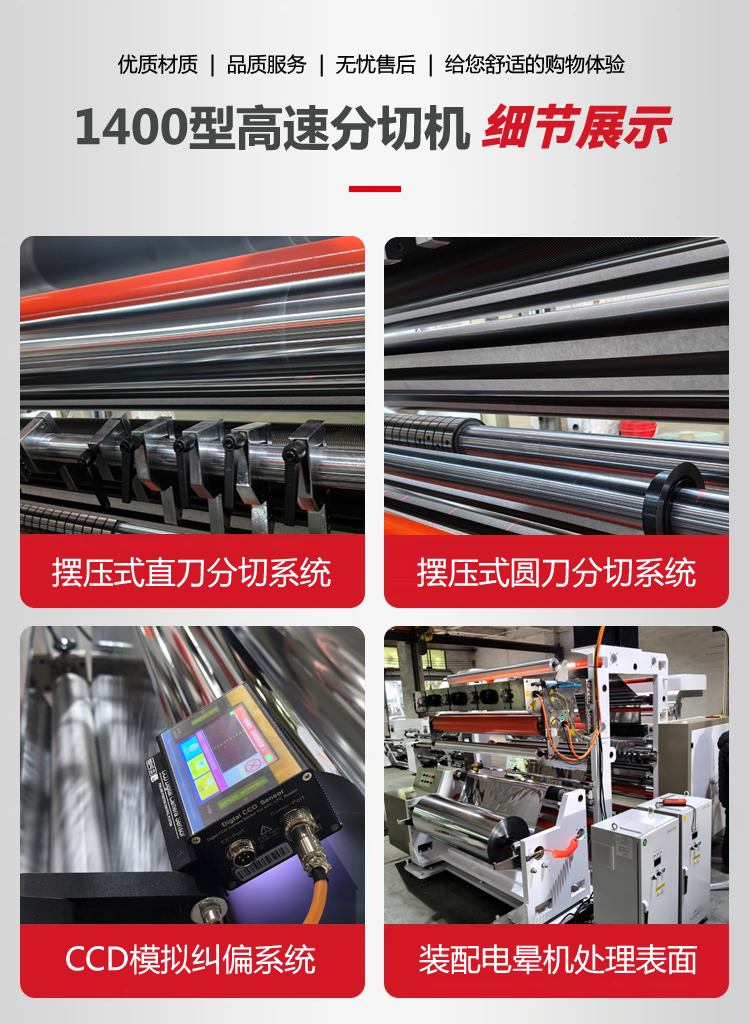 为福建客户定制的1400D4-2型电脑控制高速华体会体育,宽幅1400mm,分切速度350m/min,采用CCD模拟纠偏系统,配备摆压式直刀和圆刀分切系统,分切多种规格,按要求配置电晕机,速度150m/min。分切12u-50um卷筒类镭射膜、镀铝膜、冷烫膜、电化品等塑料薄膜